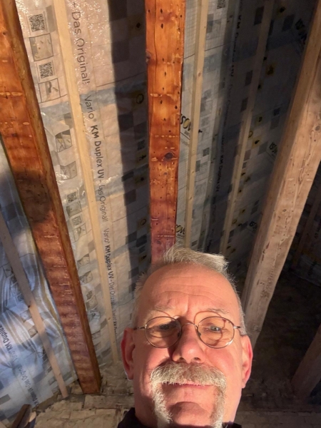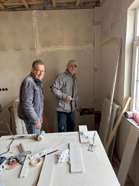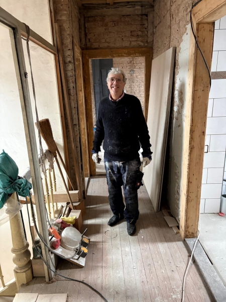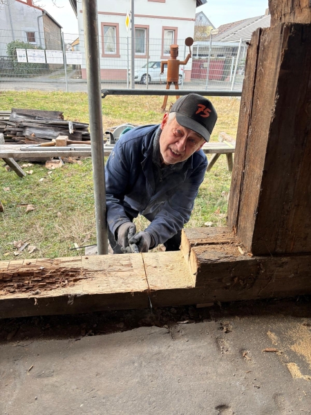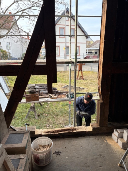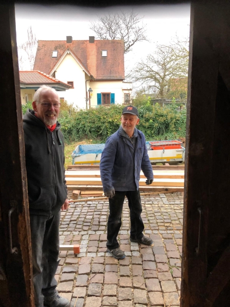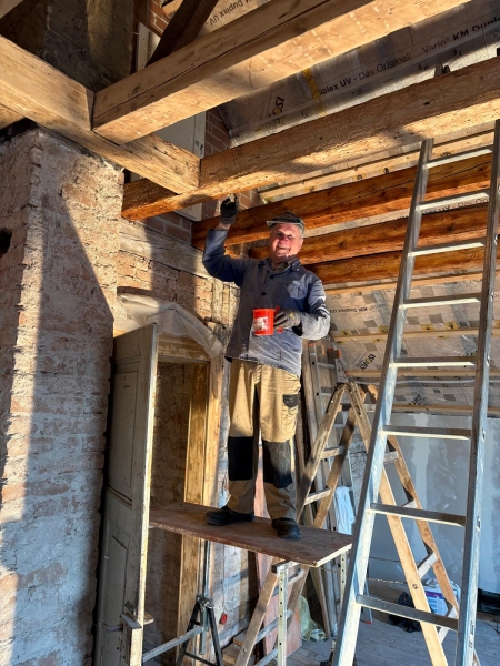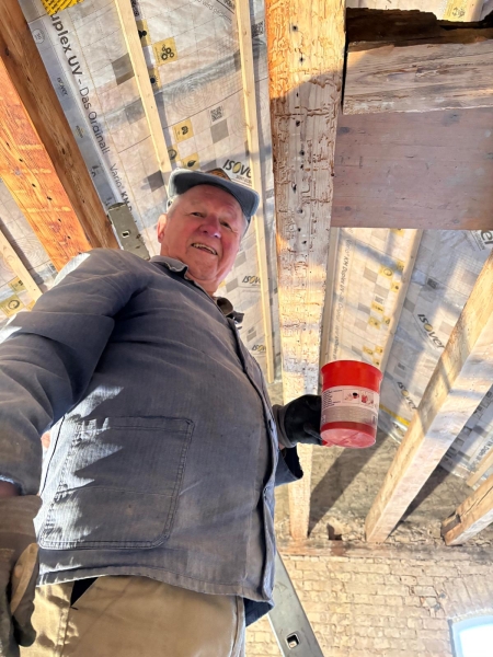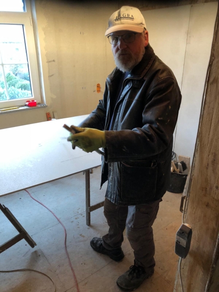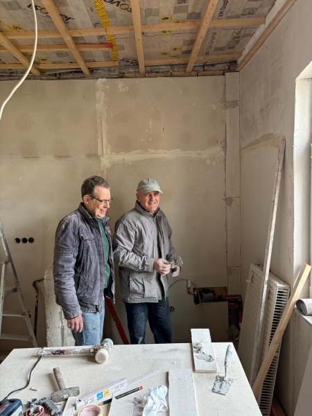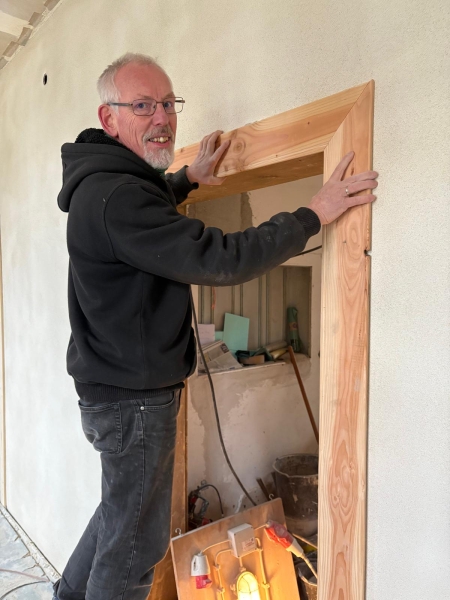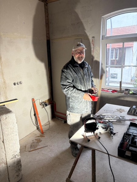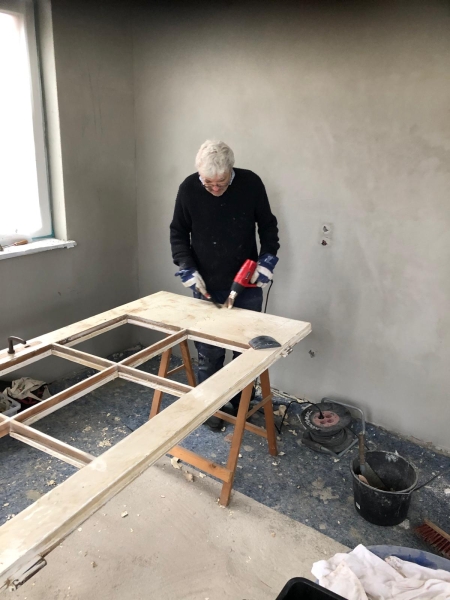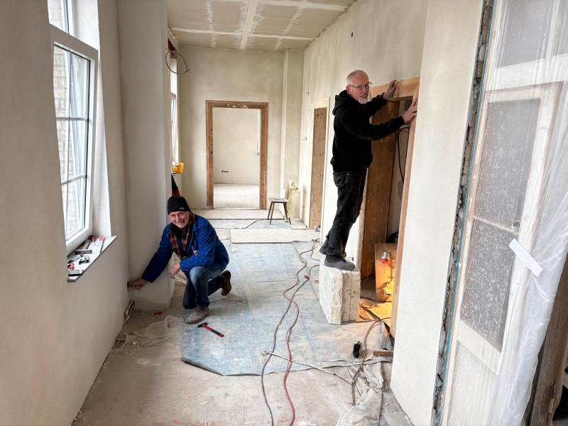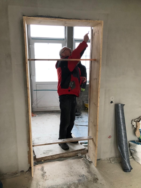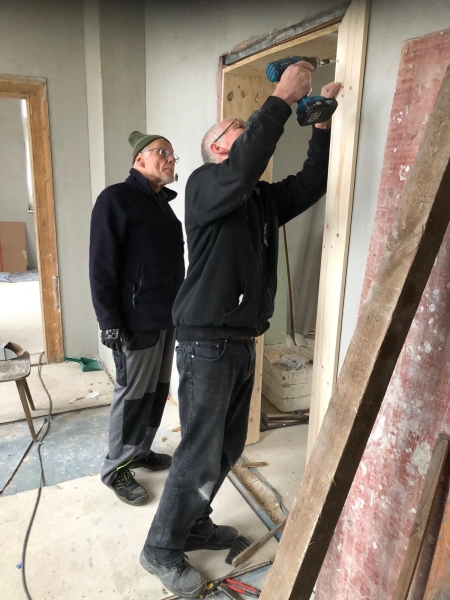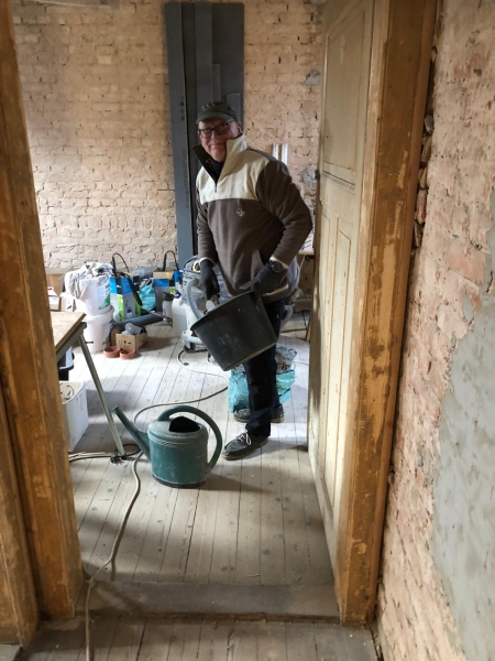 So hat Berthold angefangen, das Balkenwerk an der Stirnseite des Schuppens zu erneuern, das Inventar für die Teeküche hat ein neues Zwischenlager, die Gerüstböcke sind im Flur um den Anstrich der Decken neu zu machen, die Balken im Obergeschoss sind neu gestrichen, die neue Tür zur Küche nimmt immer mehr Gestalt an und die Fugen in den Trockenbauplatten sind neu zugegipst.