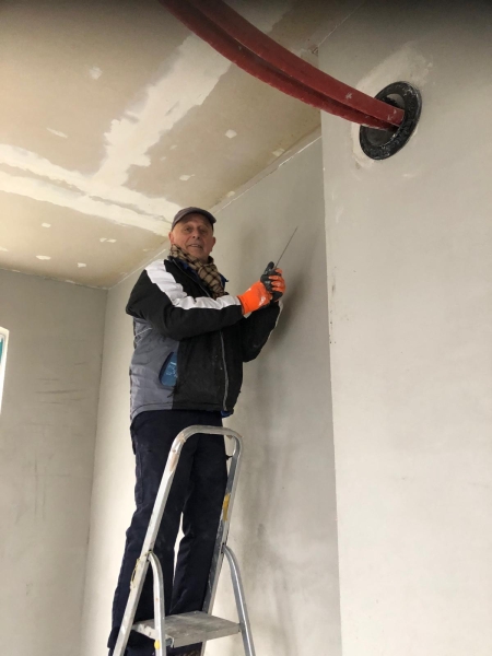 Weitere Fortschritte gab es: Die Rosette für die Heizungsschläuche wurde gesetzt, in der Küche wurde weiter an der Wandverkleidung gearbeitet. An der Schuppeverkleidung wurde gearbeitet und die Elektriker und Heizungsbauer sind weiter am werkeln.