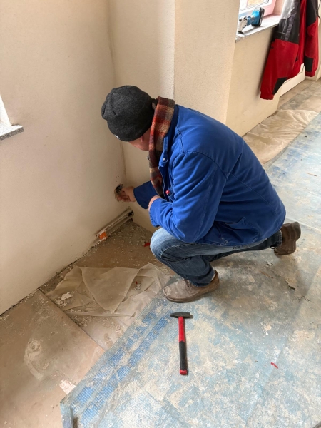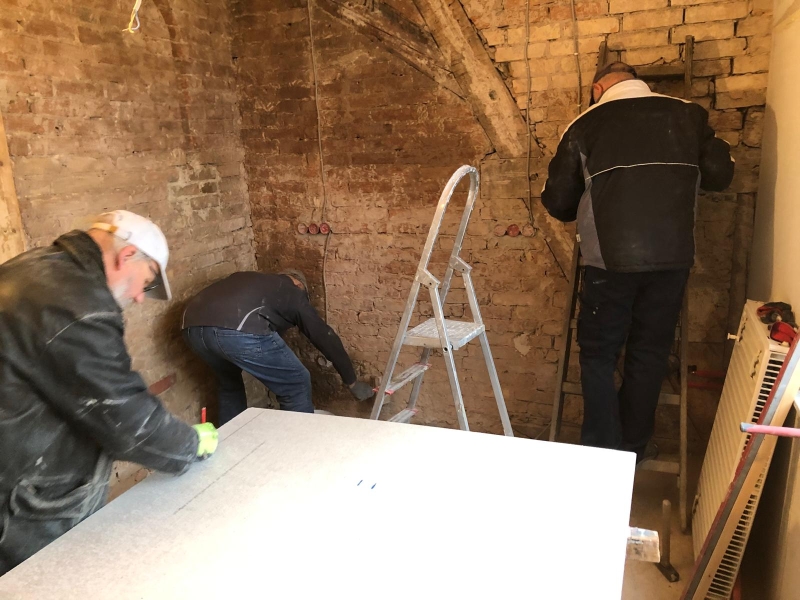 Wir haben dann an den Türrahmen, den Unterputzdosen, der Teeküche im Obergeschoss und den Balken im „Leseraum“ weiter gearbeitet.