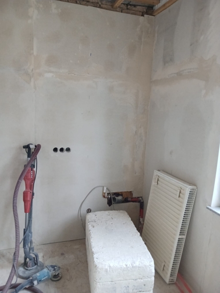Die Hoffnung bald fertig zu werden treibt uns nämlich an. Deshalb wurde heute wieder schwer gearbeitet, Decken grundiert, Rigipsplatten gespachtelt, am Schuppen verschalt, weitere Trockenbauplatten montiert, usw., usw.